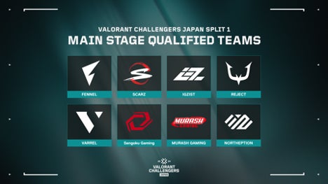 「VALORANT CHALLENGERS JAPAN SPLIT 1 MAIN STAGE 出場チーム」にはFENNEL、SCARZ、IGZIST、REJECT、VARREL、Sengoku Gaming、MURASH GAMING、NORTHEPTIONが参加します。
