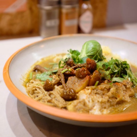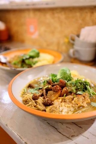 - カレーにはあんこう、なめこ、酒粕が使われ、フルーツや野菜の副菜も用意される