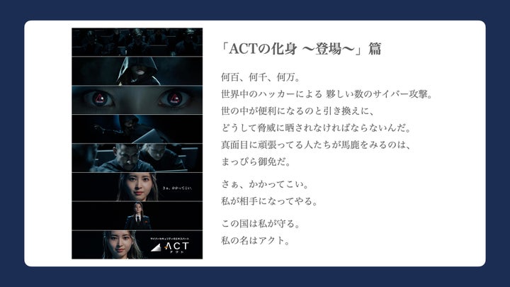 飯沼愛さんはアクトの化身として、強くて美しく、かっこよく、頼もしいホワイトハッカー役を演じます。
