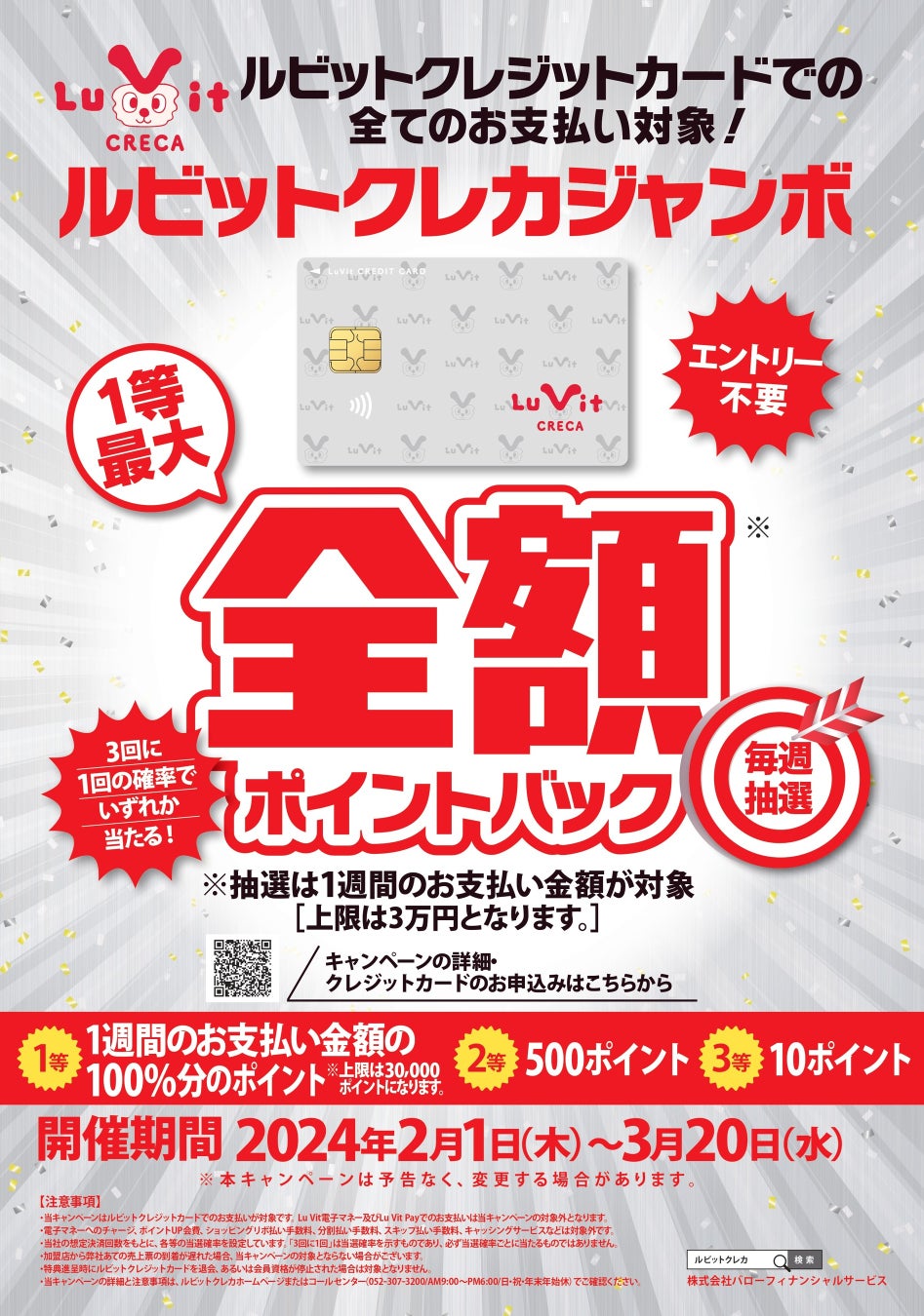 株式会社バローフィナンシャルサービスは、2024年2月1日から「ルビットクレカジャンボ」というキャンペーンを開催します。