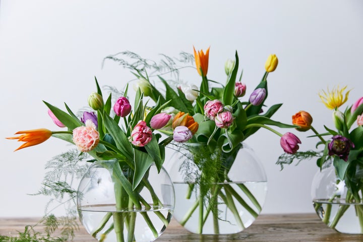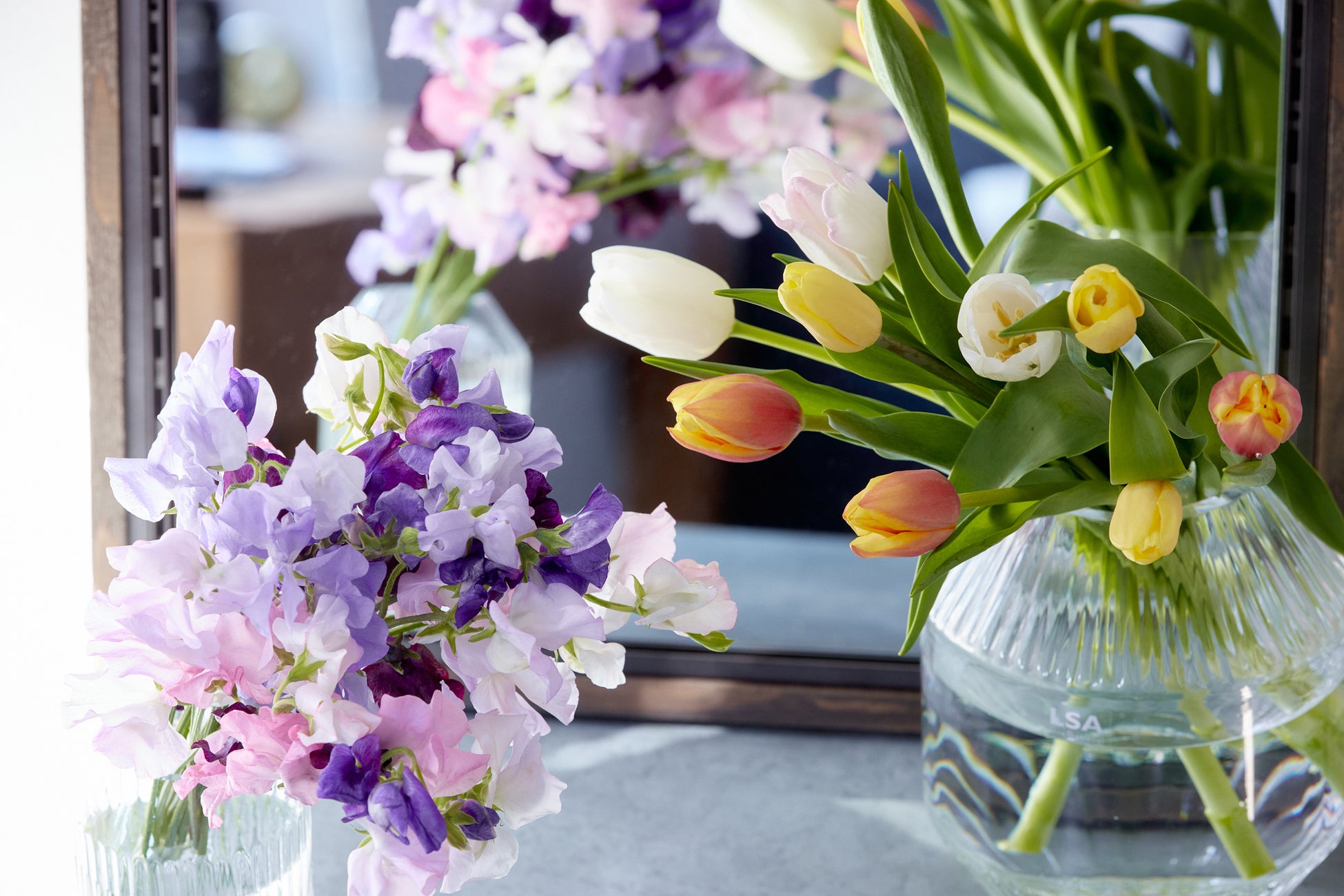 チューリップは球根付きの原種から15系統の品種を取り揃え、スイートピーは染め色が加わったカラーバリエーションを重視しています。