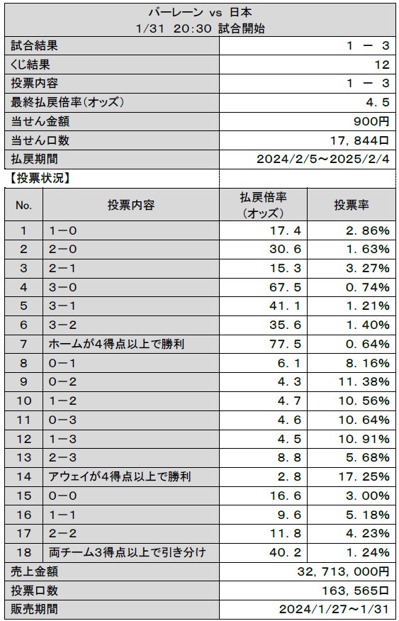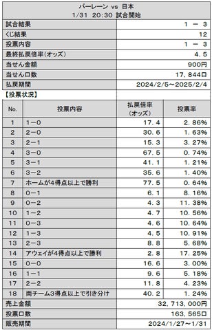- 日本代表の対バーレーン戦のくじ結果は13で日本勝利、払戻倍率は4.5倍、当せん金額は900円