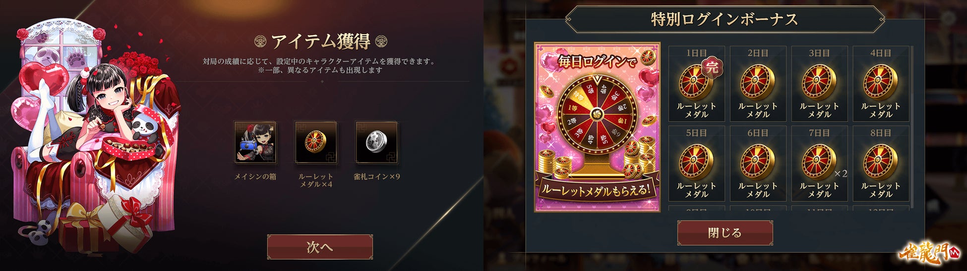 注目の報酬には、バレンタインバージョンのキャラクター「メイシン」と「メイファ」が登場します。