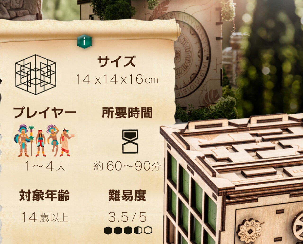 - パズルやシークレットスペースがあり、素材は樺の木やアクリル