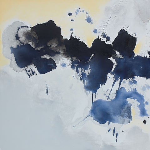 彼女はシンプルな手法でアクリル絵の具をキャンバスに垂らし、スキージで伸ばすことで作品を制作しています。