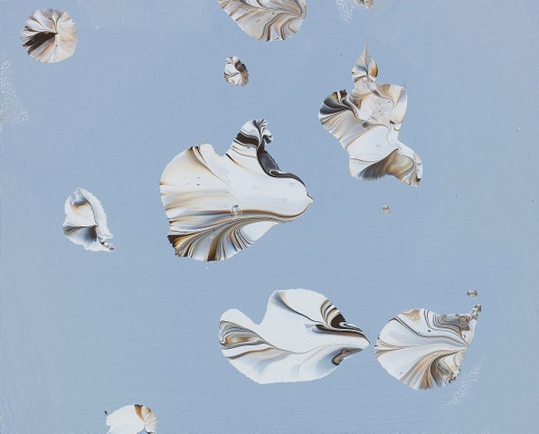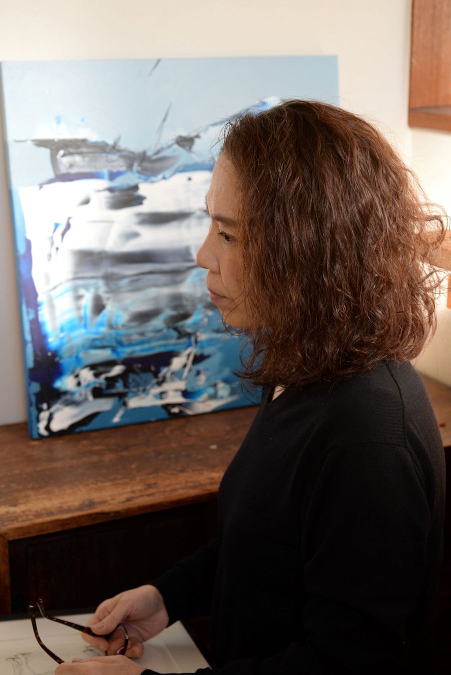 • 松丸真江はアクリル絵の具を使い、スキージで伸ばす手法で作品を制作