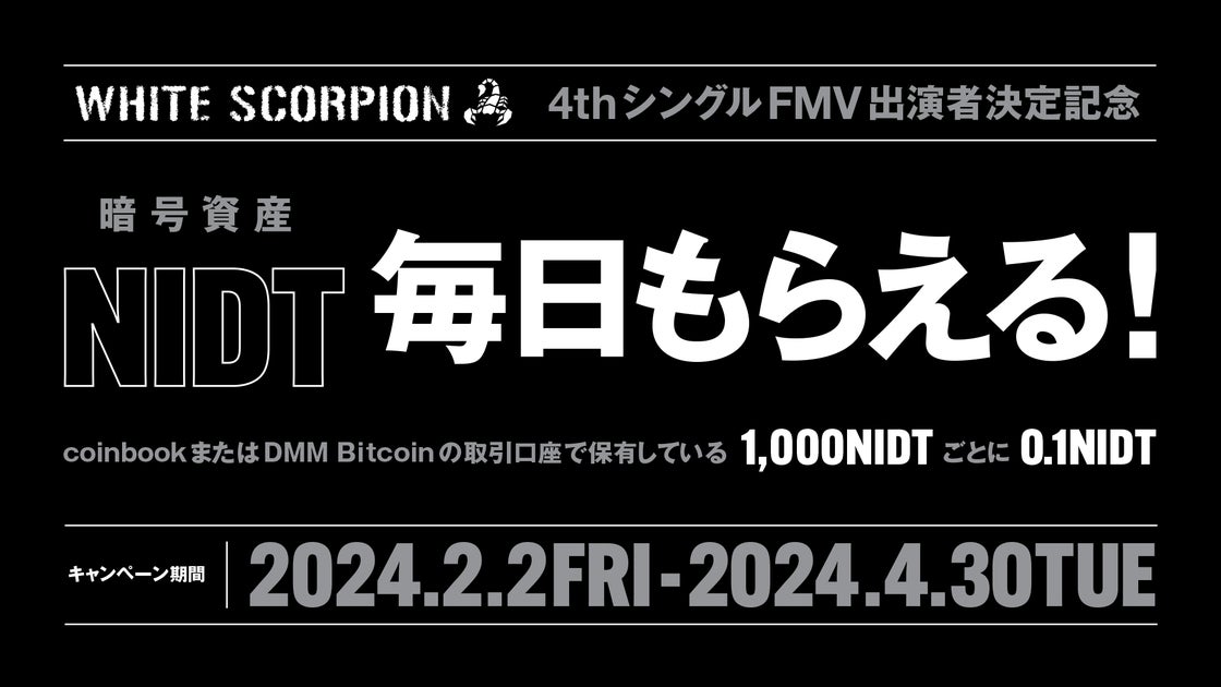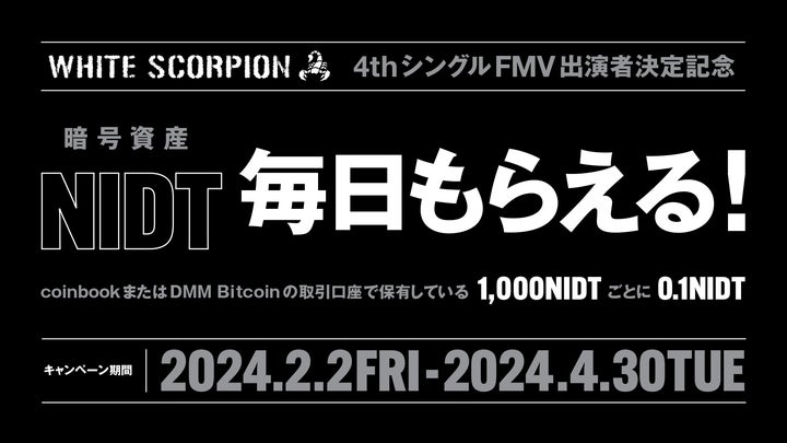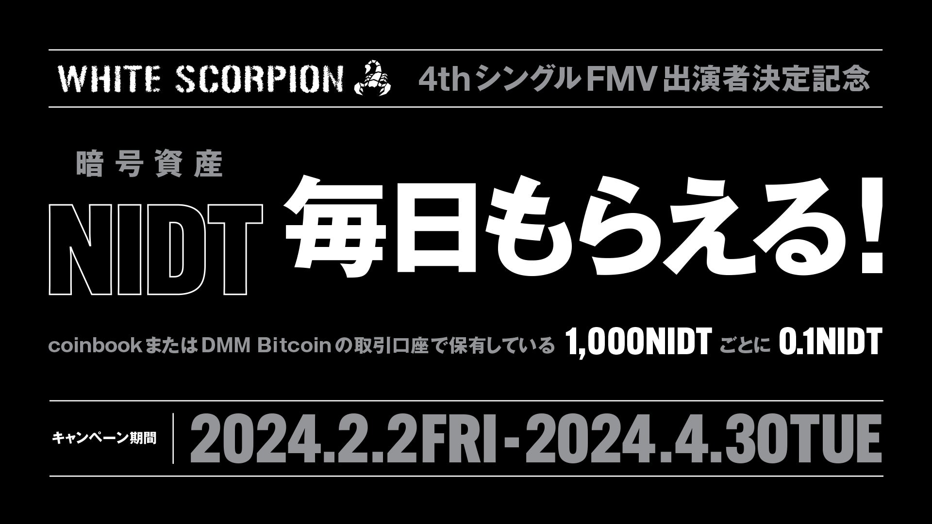 • 株式会社オーバースは、アイドルグループ「WHITE SCORPION」の4thシングル「タイトル未定」のFMV出演者決定を記念して、NIDT保有者に毎日NIDTを無償で付与するキャンペーンを実施