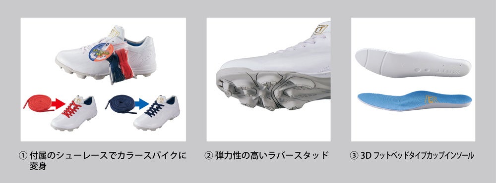 ①ホワイトアッパーモデル/ホワイト×ホワイト(1111)は、赤と紺の紐を付けることでカラースパイクに変身します。
