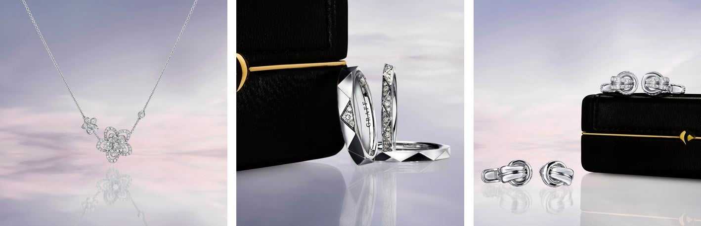 グラフのジュエリーコレクションには、フェミニンなモチーフのジュエリーやモダンなデザインのリング、カフリンクスなどがあります。
