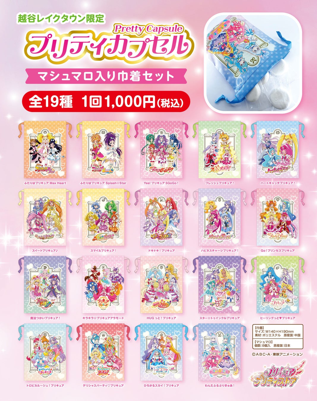 カプセルにはマシュマロ入り巾着セットが入っており、歴代プリキュアシリーズのイラストがポイントです。