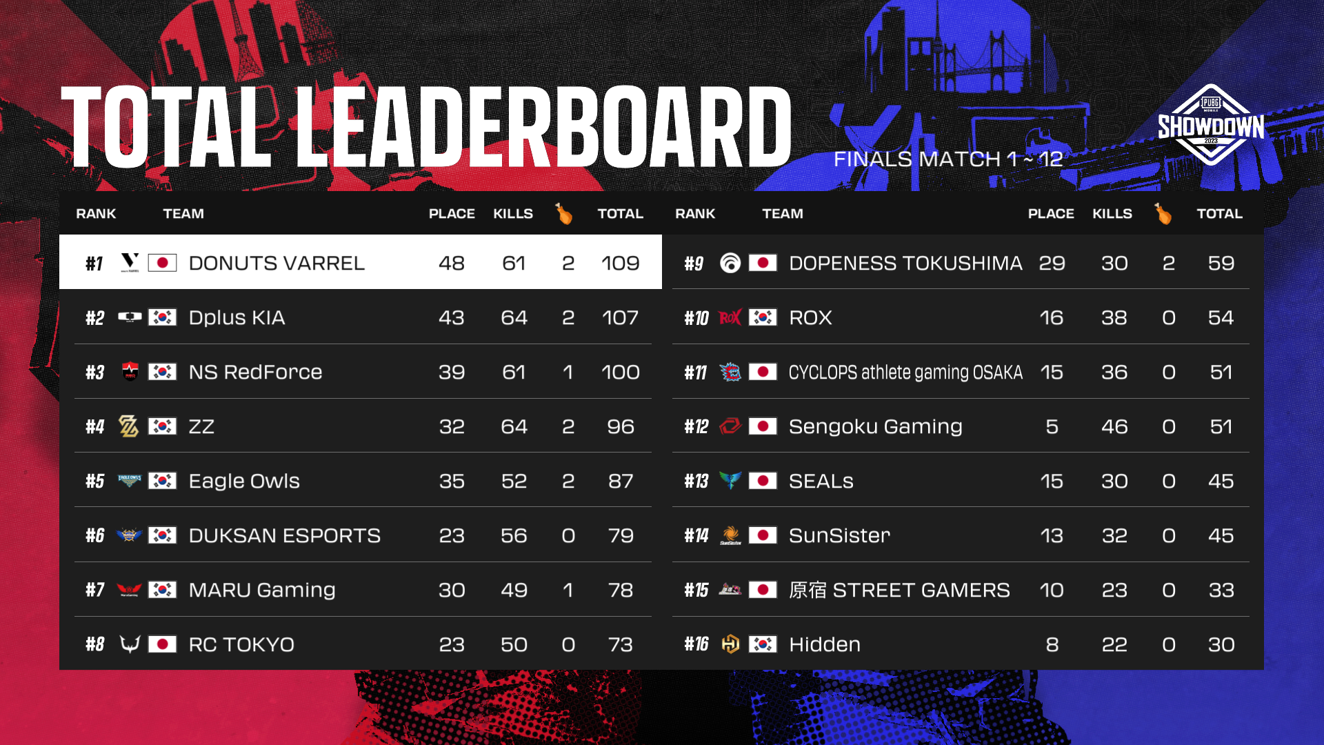 「DONUTS VARREL」は、決勝 DAY1にてRound3(Sanhok)で見事ドン勝を獲得するなど安定したポイントを稼ぎ、2位の「ZZ」(韓国)と6pt差で1位をキープしたまま折り返し、決勝 DAY2では韓国の強豪チームを中心としたライバル達に追われながらも、Round9(Sanhok)にてドン勝を獲得し更に差を広げていきました。