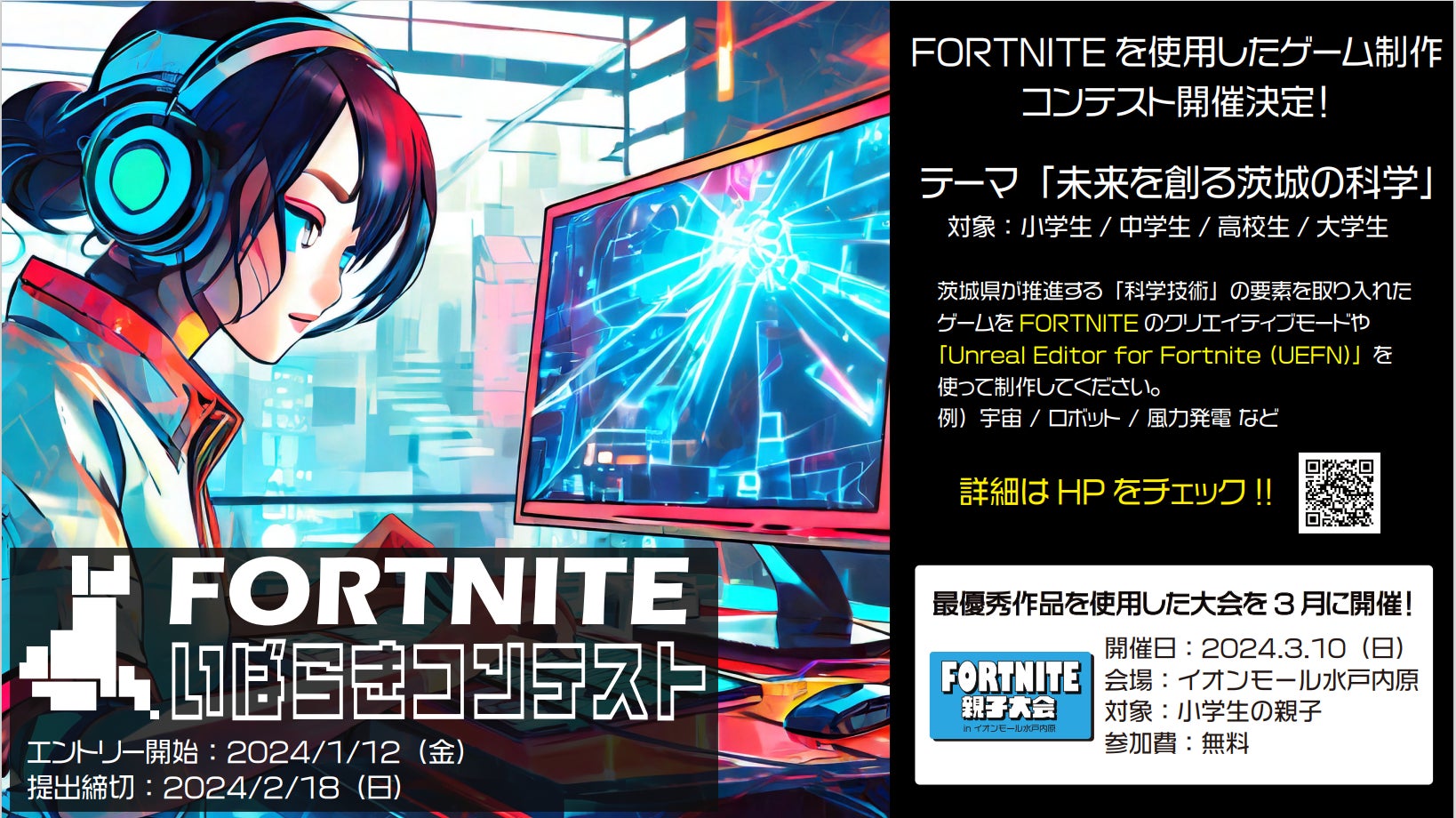 - 「FORTNITEいばらきコンテスト」は、全国の小学生から大学生を対象としたゲーム制作コンテスト。