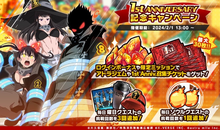 株式会社テンダのグループ会社である株式会社X-VERSE PLUSとextra mile株式会社は、スマートフォン向けゲーム『炎炎ノ消防隊 炎舞ノ章』の1周年記念キャンペーンを開催します。
