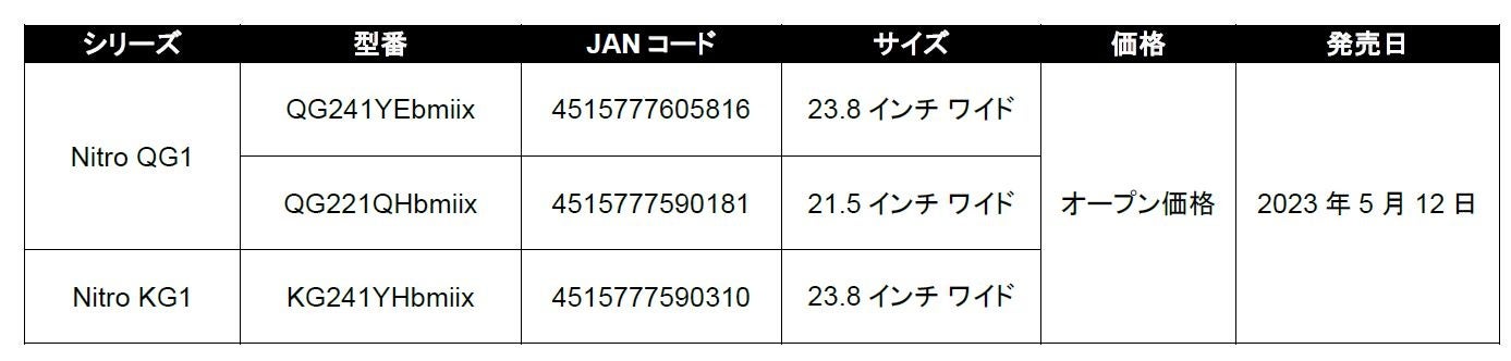 日本エイサー株式会社(本社:東京都新宿区、代表取締役社長:ボブ・セン)は、カジュアルゲーマーからコアゲーマーまで幅広いゲーマーに向けたゲーミングブランドNitro (ニトロ)より、解像度フルHDの23.8インチおよび21.5インチゲーミングモニター「QG241YEbmiix」「QG221QHbmiix」「KG241YHbmiix」の3機種を2023年5月12日(金)に発売します。23.8インチの「QG241YEbmiix」はIPSパネル搭載、21.5インチ「QG221QHbmiix」と23.8インチ「KG241YHbmiix」はVAパネルを採用。リフレッシュレートは従来機種の75Hzからパワーアップし、100Hzに対応した新製品です。なお、本製品はAmazonにて販売します。