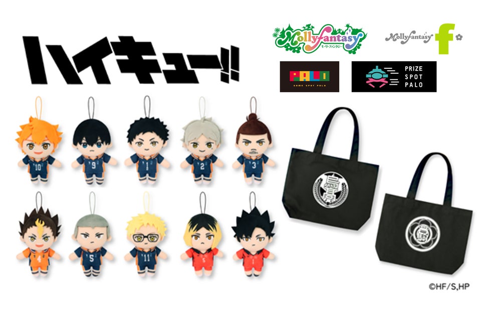 烏野高校の日向翔陽、影山飛雄、澤村大地、菅原孝支、東峰旭、西谷夕、田中龍之介、月島蛍、音駒高校の孤爪研磨、黒尾鉄朗のかわいいマスコットぬいぐるみと、烏野高校と音駒高校のスクールアイコンをモチーフにしたトートバッグの全12種類が展開されます。