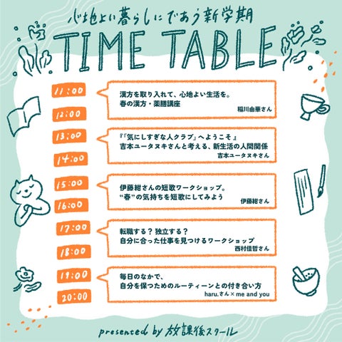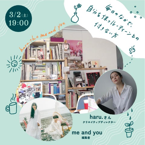 このイベントでは、漢方養生栄養士の稲川由華さんによる漢方の取り入れ方や、吉本ユータヌキさんとの人間関係の乗り切り方、伊藤紺さんとの短歌ワークショップ、西村佳哲さんとの自分に合った働き方の考え方、そしてharu.さんとme and youによる心の保ち方についての講座が行われます。