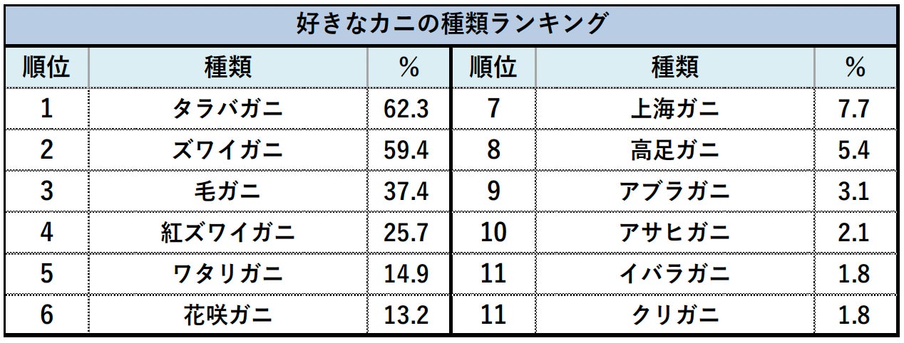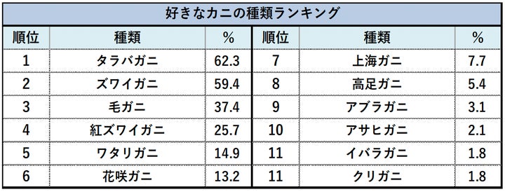 結果からは、全体の70.0%の人がカニが好きであり、1位はタラバガニ(62.3%)、2位はズワイガニ(59.4%)、3位は毛ガニ(37.4%)でした。
