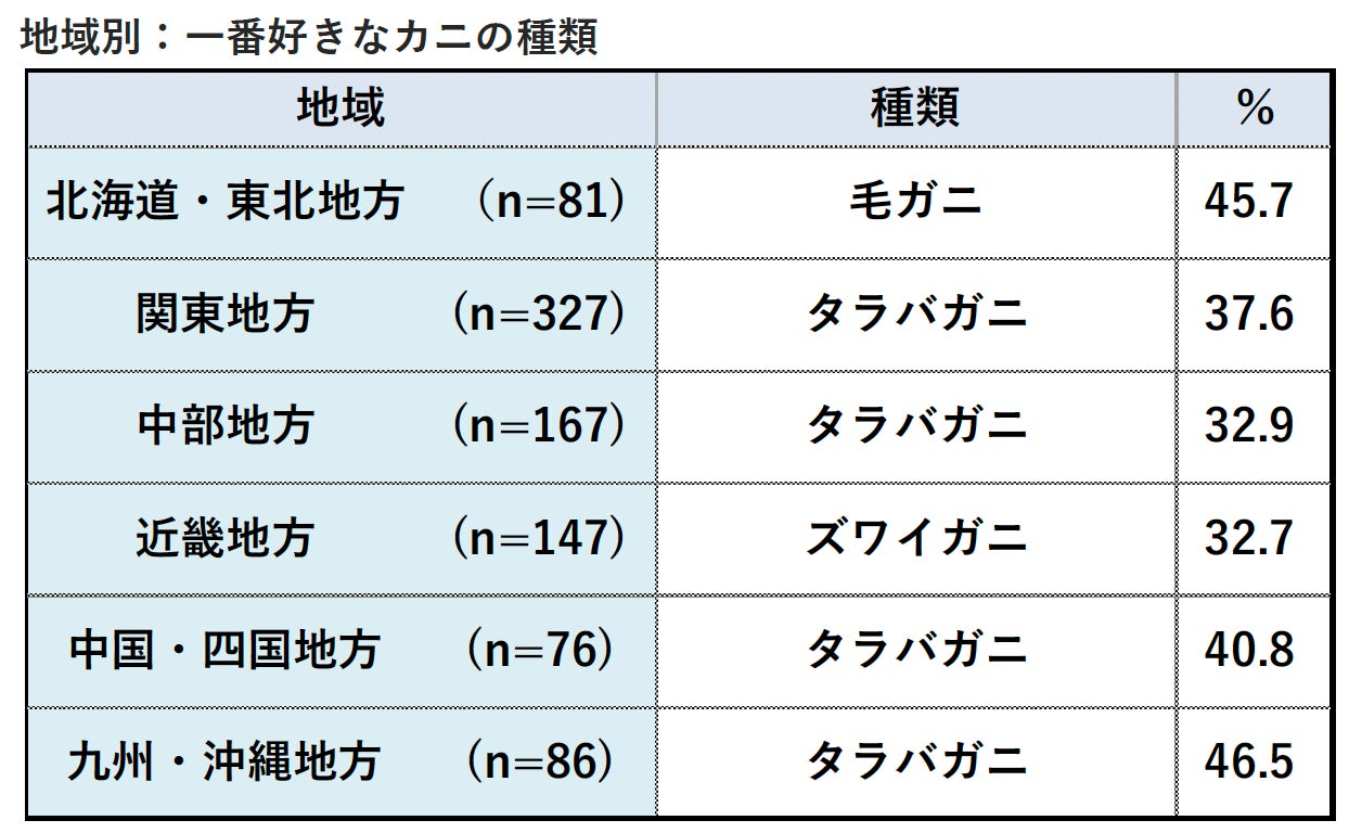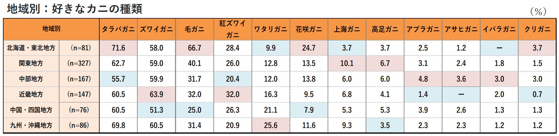 - 地域別では、タラバガニは北海道東北地方、ズワイガニは近畿地方で特に支持率が高い