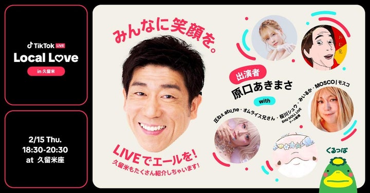 2024年2月15日(木)に開催される「TikTok LIVE Local Love in 久留米」は、福岡県出身の原口あきまささんと人気TikTokクリエイターが出演するイベントです。