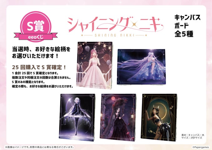 S賞にはキャンバスボード、A賞にはキャラトートバッグ、B賞にはアクリルスタンド、C賞にはアクリルぷちスタンド、D賞には缶バッジが用意されています。