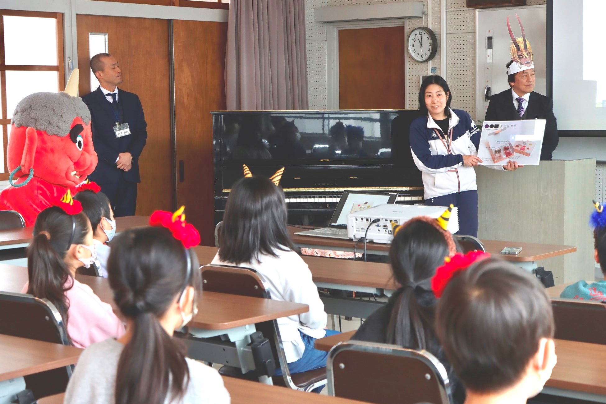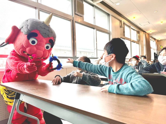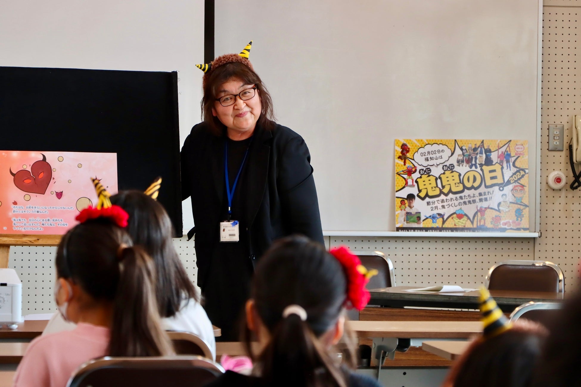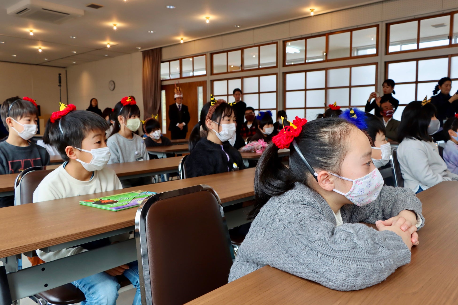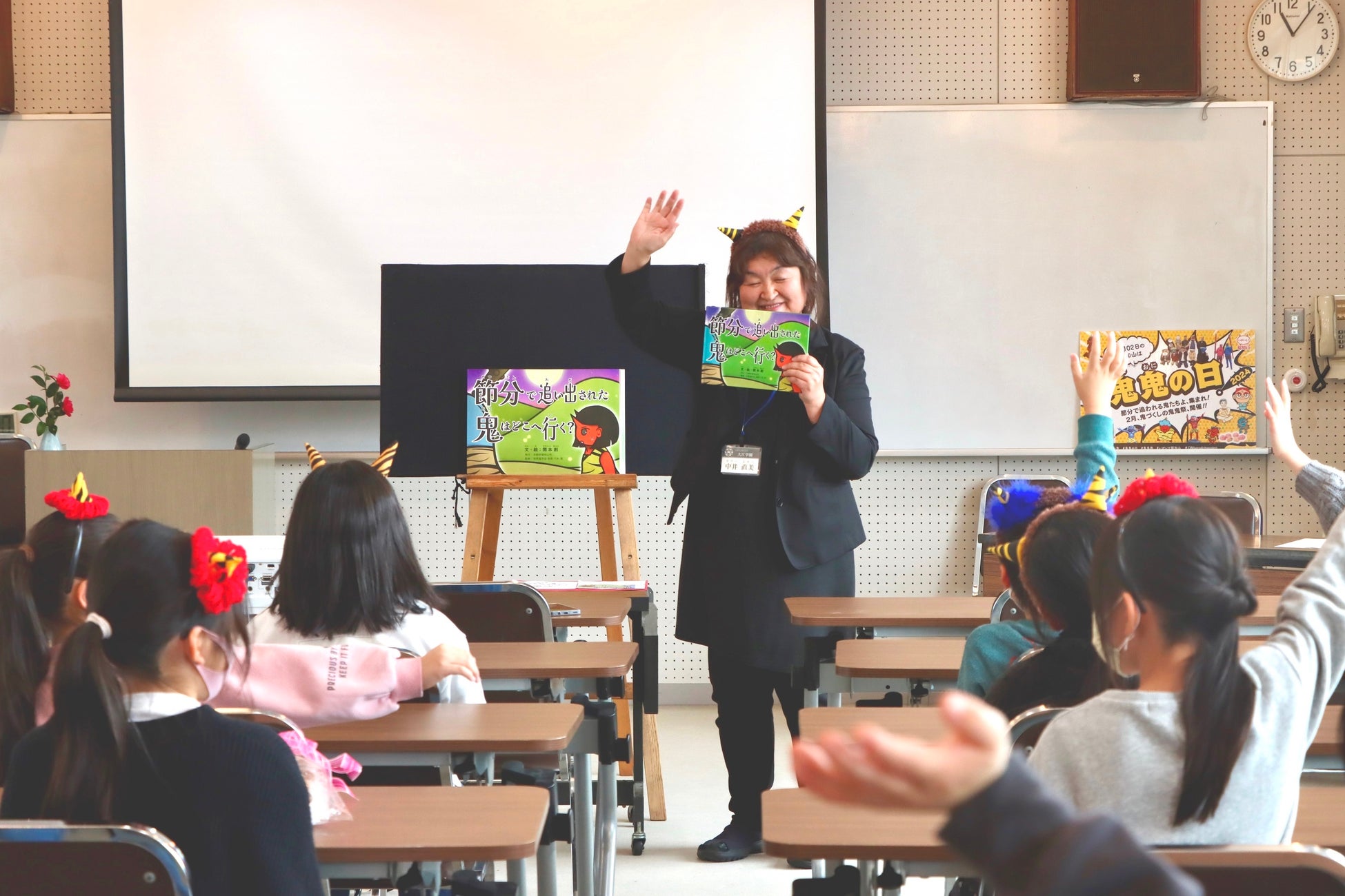 福知山市で開催された特別授業では、オリジナル絵本『節分で追い出された鬼はどこへ行く?』の読み聞かせ会が行われました。