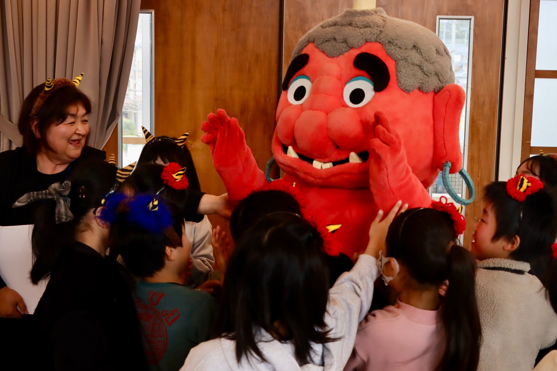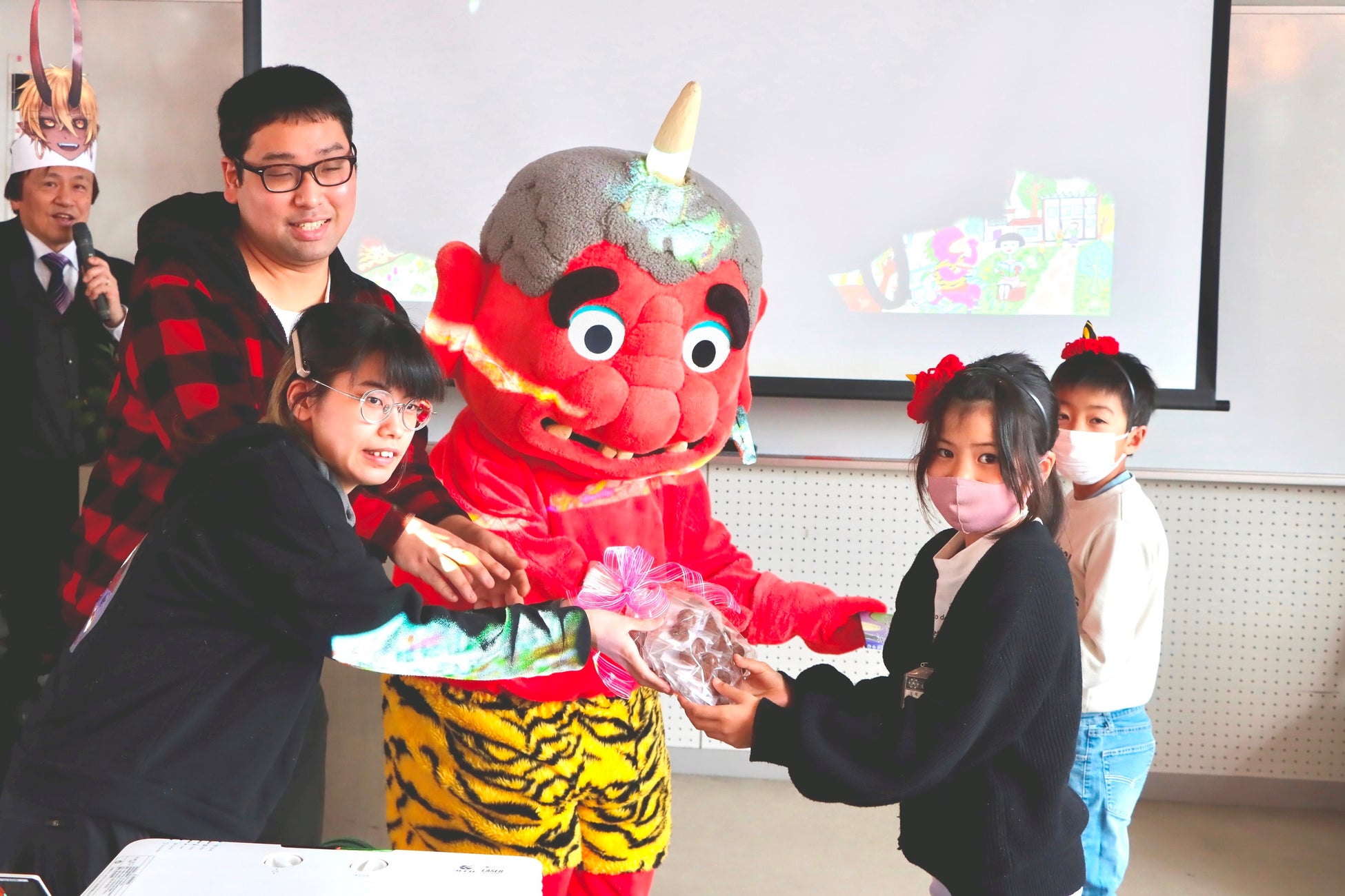 また、市の公式キャラクター「酒吞童子」からはオリジナル絵本と一緒に「鬼とヒトが仲良くなれる豆クッキー『おにさんこちら』」も贈呈されました。