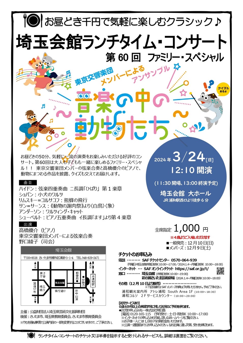 - コンサート・シリーズ、第60回、ファミリー・スペシャル、動物、クイズコーナー、クラシック音楽、2024年3月24日、埼玉会館大ホール、全席指定、1,000円