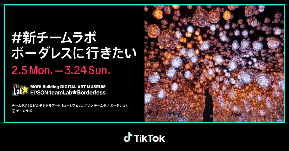 TikTok(ティックトック)では、2024年2月5日から3月24日まで、森ビル 麻布台ヒルズの「森ビル デジタルアート ミュージアム:エプソン チームラボボーダレス」のペアチケットが抽選で300組に当たるキャンペーンを開催しています。