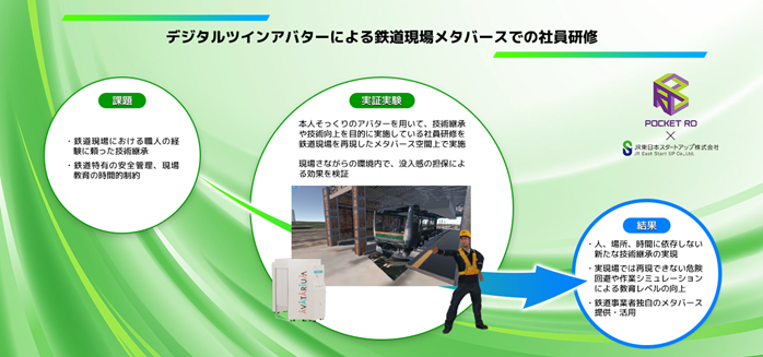東日本旅客鉄道株式会社(代表取締役社長:深澤祐二、以下「JR東日本」)とJR東日本スタートアップ株式会社(代表取締役社長:柴田裕)が開催したJR東日本スタートアッププログラム2022春において、XR技術により世界中の人々のあらゆるコミュニケーションをより表現豊かにするソリューションを持つ株式会社 Pocket RD(以下、「Pocket RD」)(本社:東京都渋谷区、代表取締役:籾倉宏哉)が提供するAVATARIUMで生成されたアバターを活用したシリアスメタバース(=産業用メタバース)における社員研修への活用について実証実験を実施しました。