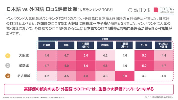 特に大阪城は外国語口コミが100件以上寄せられ、高評価を獲得しています。