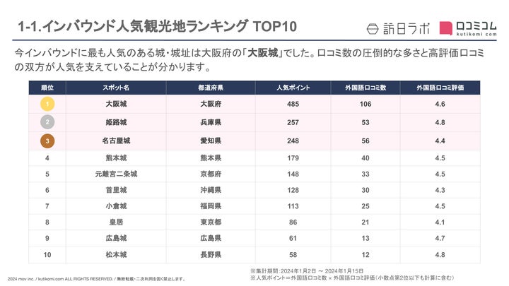 訪日ラボが選出した国内の「城・城址」78箇所の口コミを調査し、インバウンド人気観光地ランキングを発表しました。