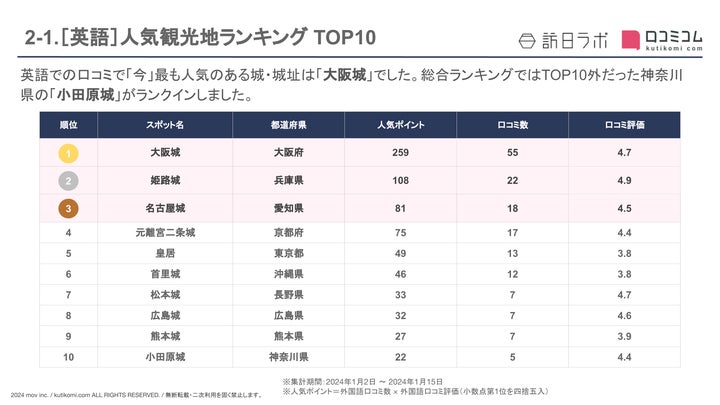 1位は大阪城で、2位は姫路城、3位は名古屋城となっています。