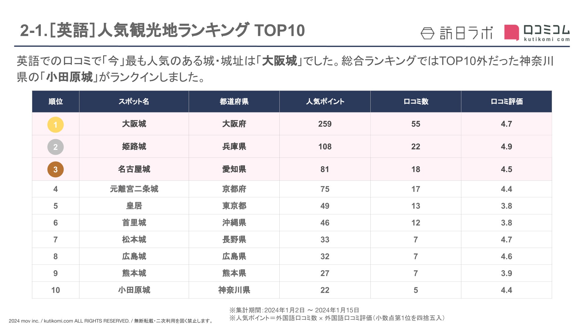 - 大阪城は外国語口コミが100件以上寄せられ、高評価
