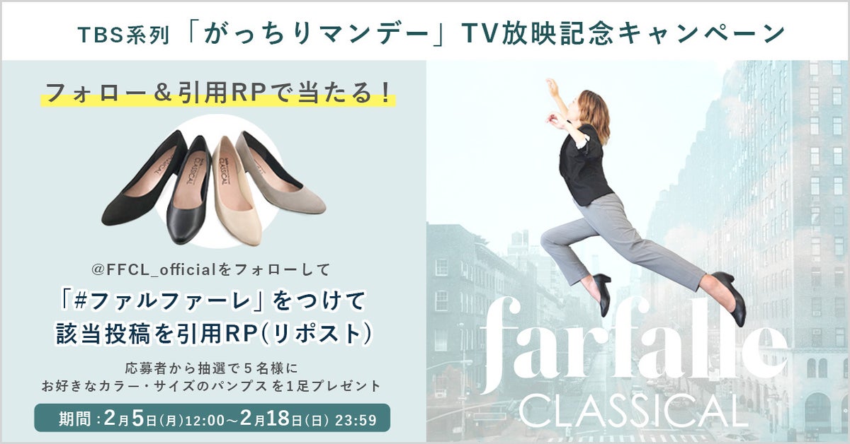 クロシェのレディースアパレルに関連して、TBS系列の番組『がっちりマンデー!!』で紹介されたファルファーレのパンプス「クラシカル(マインツー)」を記念してキャンペーンを実施します。