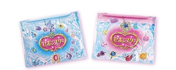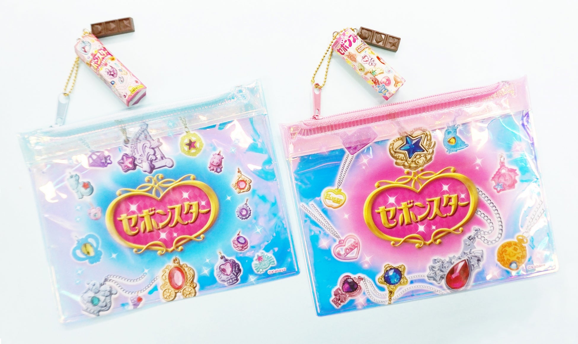 オーロラ色のビニールポーチにはセボンスターのロゴと歴代アクセサリーがプリントされています。