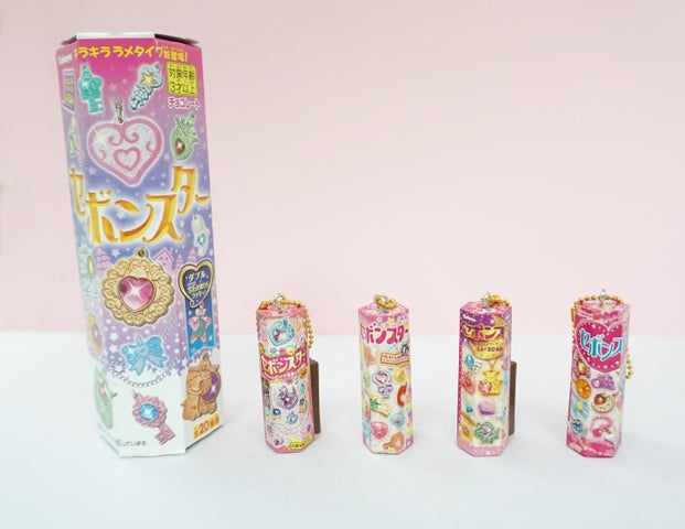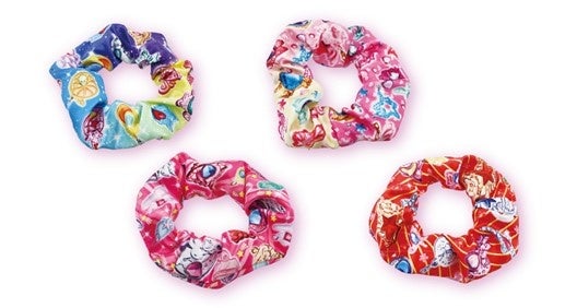 ミニチュアマスコットは過去のパッケージを再現し、シュシュにはキラキラなアクセサリーがプリントされています。