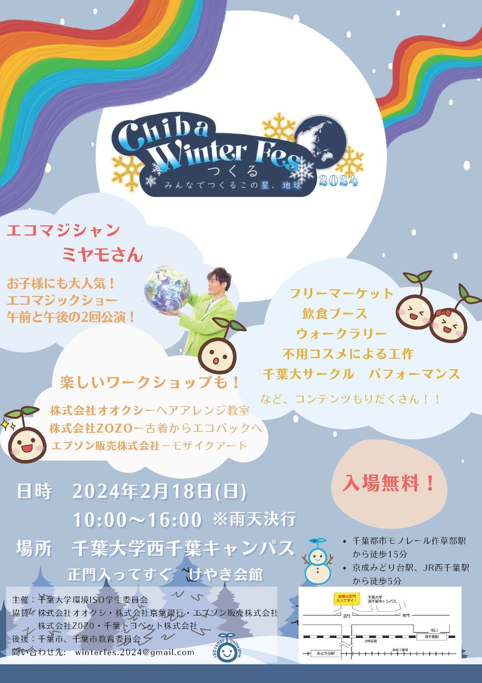 主催は千葉大学環境ISO学生委員会で、協賛は株式会社オオクシ、株式会社京葉銀行、株式会社ZOZO、エプソン販売株式会社、千葉トヨペット株式会社です。