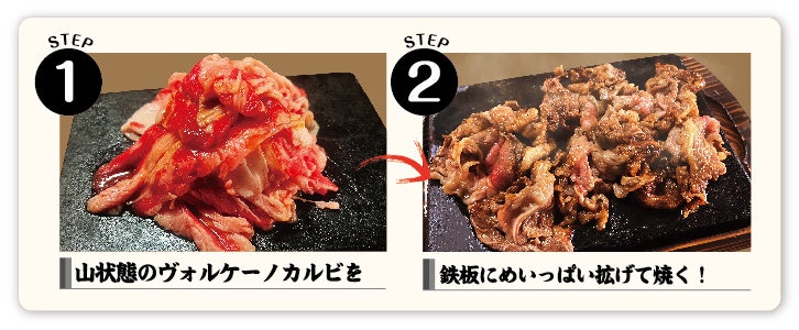 イベントでは全サイズが2割増量され、ヴォルケーノカルビをあつあつ溶岩プレートに広げて焼き加減を調整してお召し上がりいただけます。