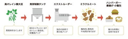 従来の植物肉は、大豆搾油後の残渣物である脱脂加工大豆を主原料としていましたが、「ミラクルミート」は原料に丸大豆まるごとを使用しています。さらに、オレイン酸リッチ大豆を使用することで、大豆特有の臭みを無くし、異風味を低減しています。