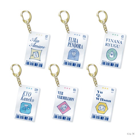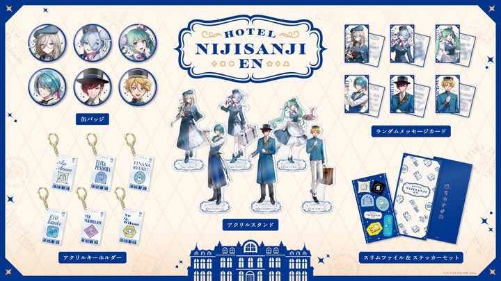 このグッズは、ホテルで働くライバーをテーマにしたアイテムで、アクリルスタンド、缶バッジ、ランダムメッセージカード、アクリルキーホルダー、スリムファイル&ステッカーセットの5種類があります。