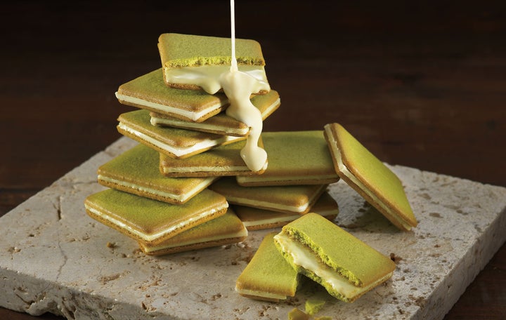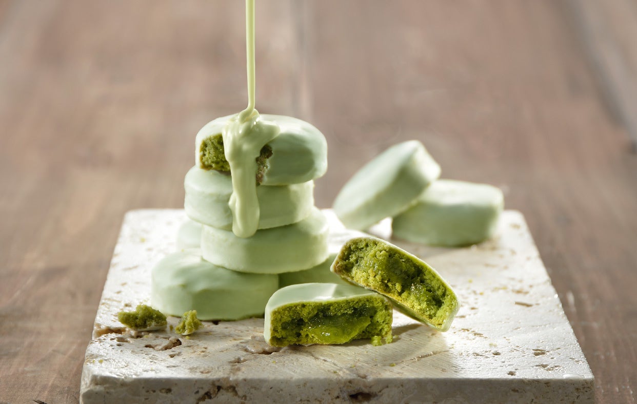 宇治抹茶とイタリア産ホワイトチョコレートを練り込んだ生地の中に宇治抹茶クリームを入れ、ホワイトチョコでコーティングしています。