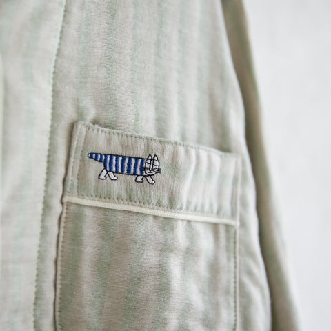 カラーはモスグリーンのストライプとグリーンの無地で、サイズはS、M、L、LLが用意されています。