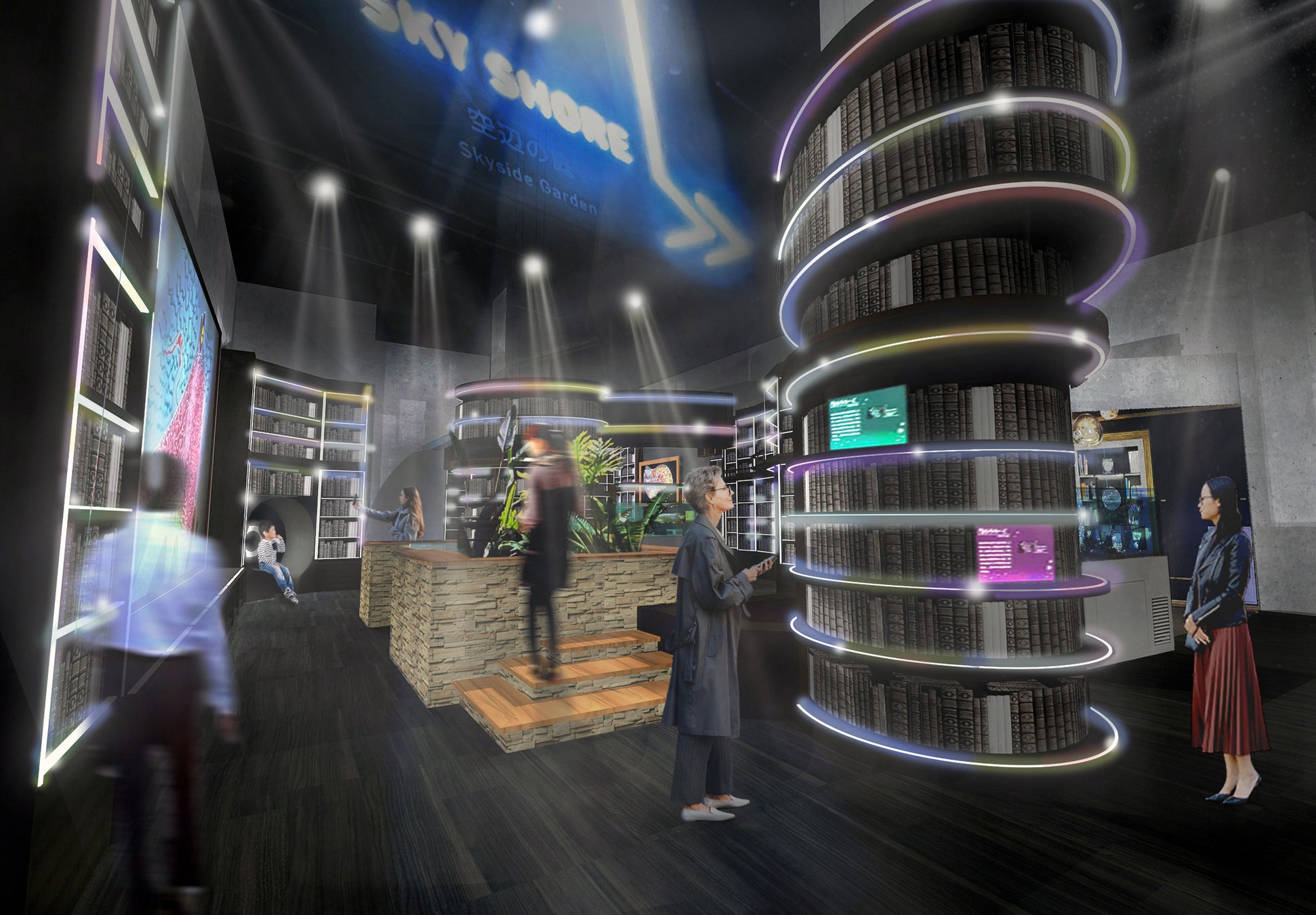 - 書棚が配置されたFOYER探求の室で、2500冊以上の書籍や標本、サイネージ、照明などが展示