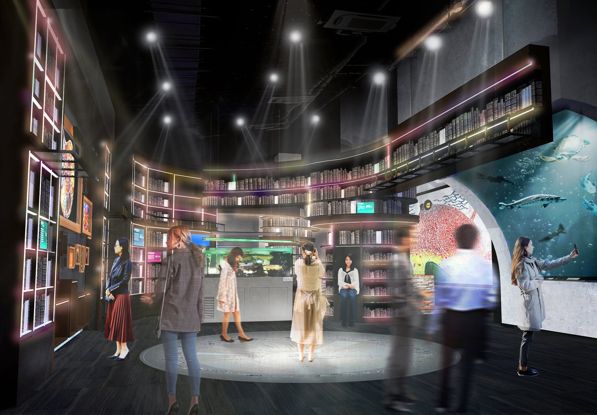 FOYER探求の室が全面改装され、魚たちが泳ぐ水槽の周りには書棚が配置されます。