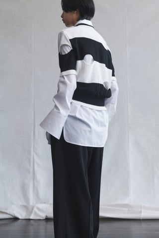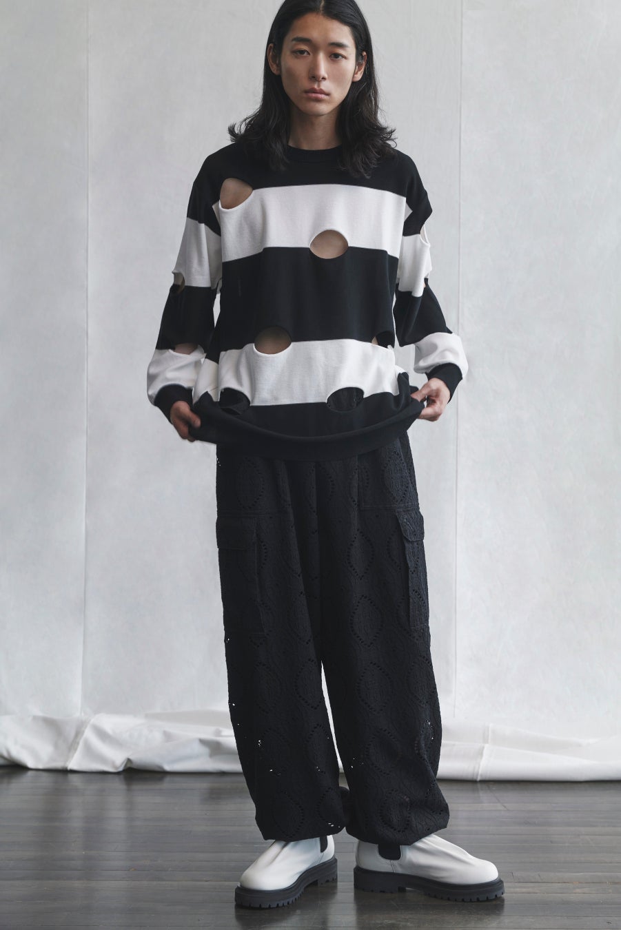 ボーダー柄にドットが穴あきで表現されたデザインはユニークで楽しさを演出し、春夏のアクティブなムードを作り出します。
