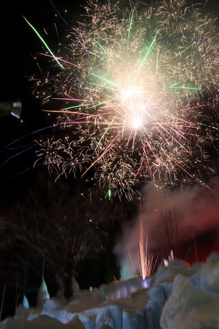 ③冬の夜空に広がる大花火 氷まつりの最後には、氷点下の森の夜空に打ち上げられる大花火が楽しめます。