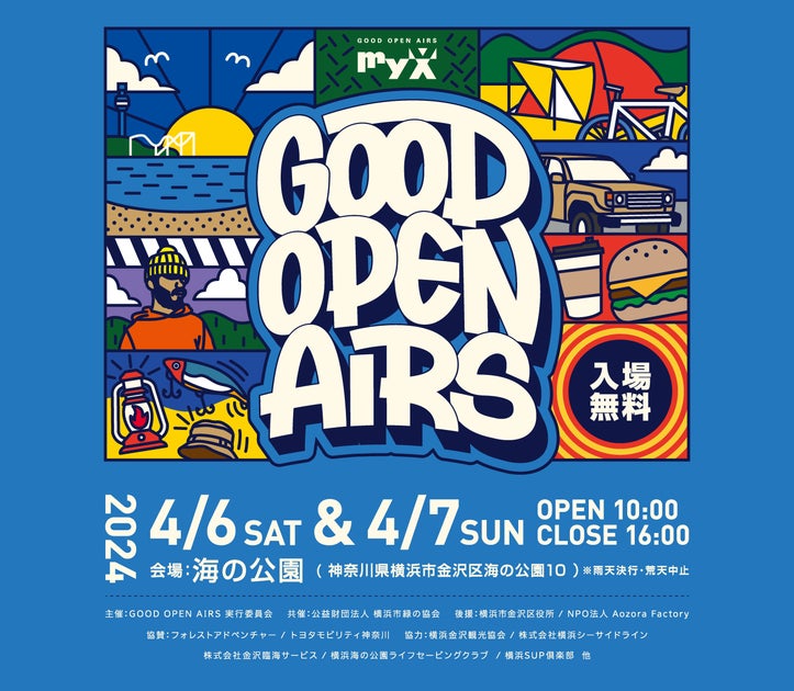 GOOD OPEN AIRS 実行委員会は、2024年4月6日(土)と7日(日)の2日間、横浜・海の公園でアウトドアイベント「GOOD OPEN AIRS 2024」を開催します。