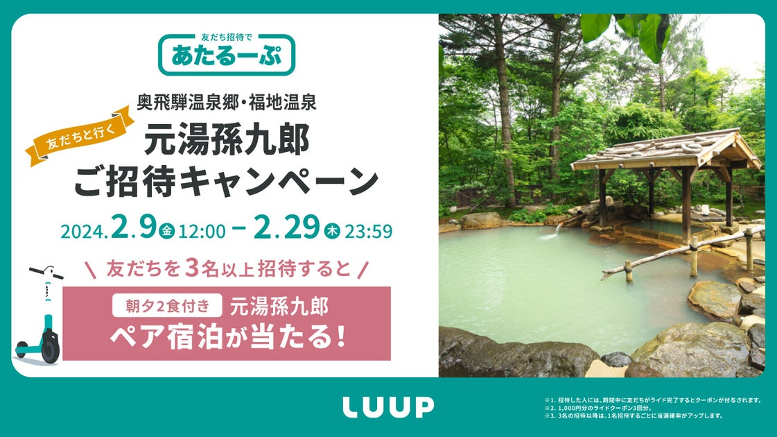 さらに、3人以上招待すると、奥飛騨温泉郷の高級旅館「元湯 孫九郎」のペア宿泊が抽選で5組に当たります。