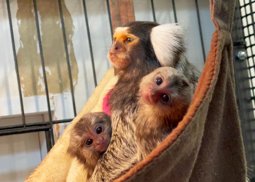 コモンマーモセットは家族で育児をする習性があり、赤ちゃんは父親の背中にしがみついたり、母親に抱えられたりします。