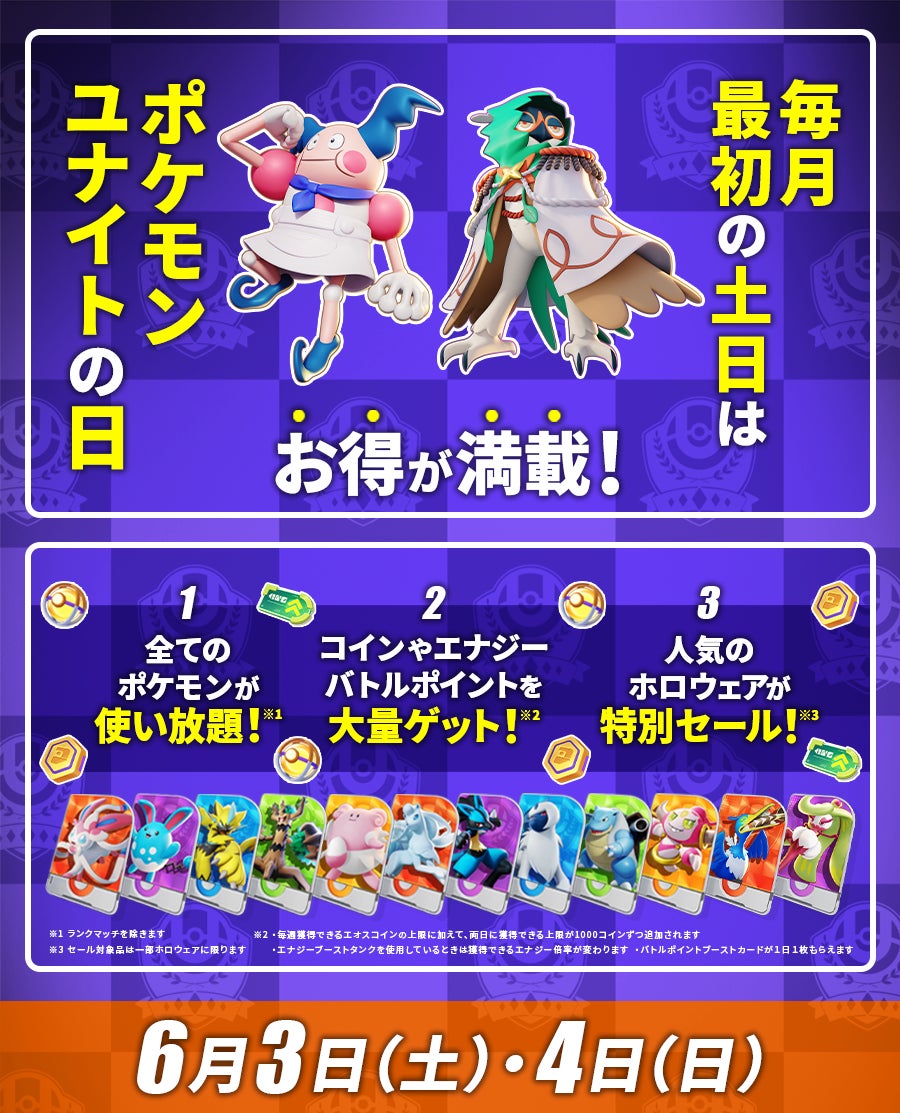 1.全ポケモンが無料で遊べる!:すべてのポケモンのユナイトライセンスが無料開放されます。気になっていたポケモンを試してみるのに、絶好の機会です。 ※ランクマッチでは使えません。 2.ホロウェアのセール開催!:一部のホロウェアがセールになります。 3.エオスコイン増量キャンペーン!:バトルした際に、通常より多くのエオスコインがもらえます。 ※バトルに1回参加すると、100コインを獲得できます。 ※毎週獲得できるエオスコインの上限に加えて、両日に獲得できる上限が1,000コインずつ追加されます。 4.エオスエナジー増量キャンペーン!:バトルした際に、エオスエナジーが追加で1倍もらえます。エオスエナジーを集めてエナジーリワードに転送し、報酬をゲットしましょう! ※「エナジーブーストタンク」を使用していた場合は合計3倍、「エナジーブーストタンク(4倍加速)」なら合計6倍のエオスエナジーを獲得できます。 5.バトルポイントが2倍!:両日とも、初回ログイン時に「バトルポイントブーストカード(1日)」が1枚もらえ、獲得するバトルポイントが2倍になります。 ※「バトルポイントブーストカード(1日)」は、受け取ってから24時間の間、バトル終了時にもらえるバトルポイントが2倍になります。